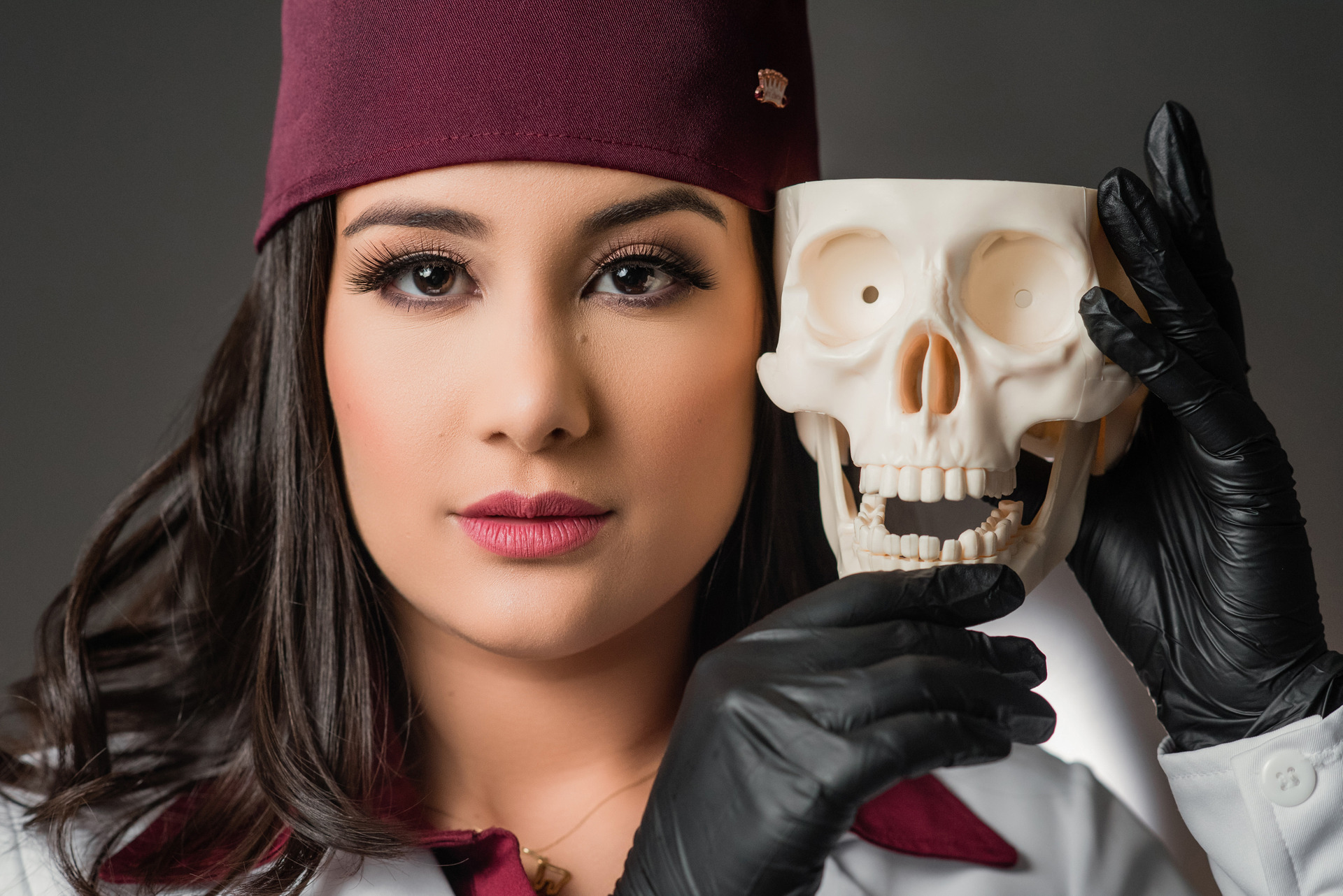Beca, cadeira e opções de fotos em fundo branco, cinza ou preto e ambiente externo